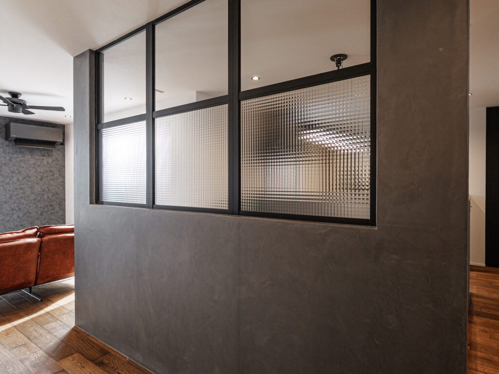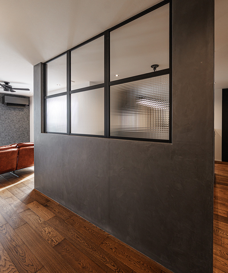 扉を設けず、パーティションで緩やかに仕切る。モールテックスとチェッカーガラスが描く陰影。