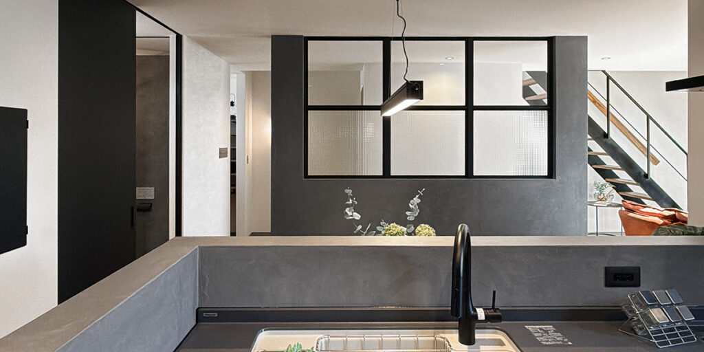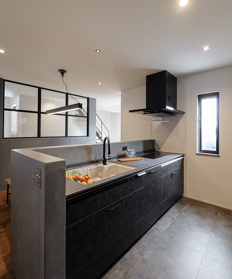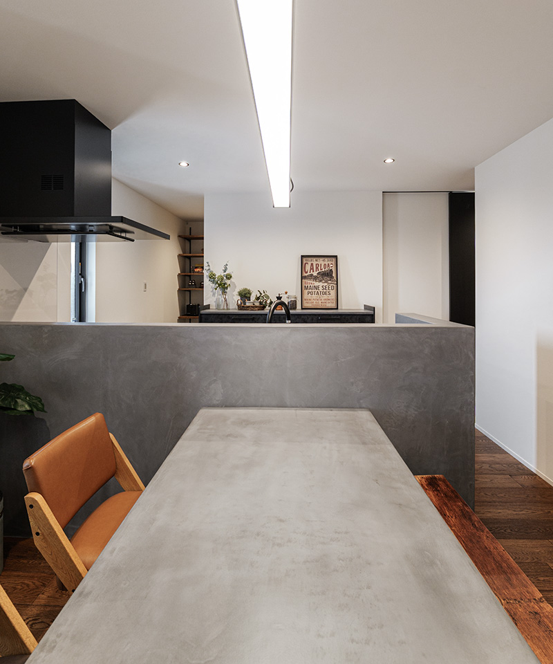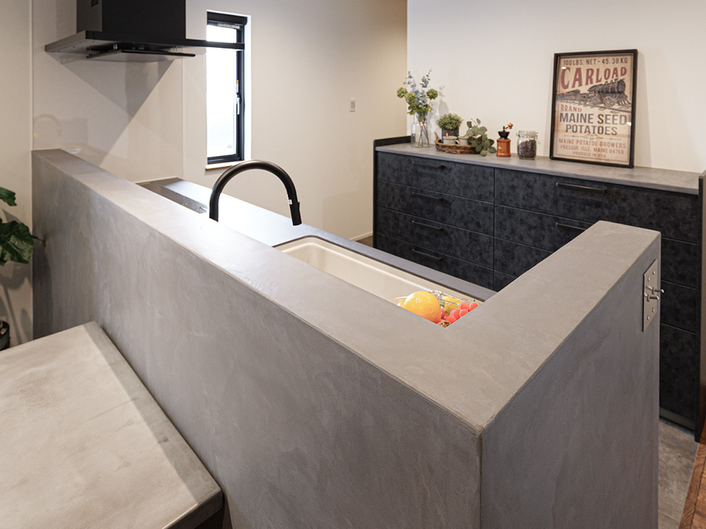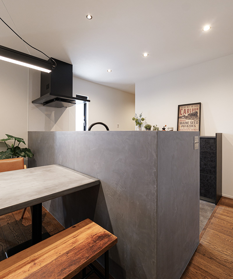 モールテックスの腰壁が手元を隠し、生活感を抑えながら落ち着いた印象をつくります。