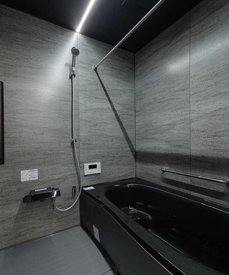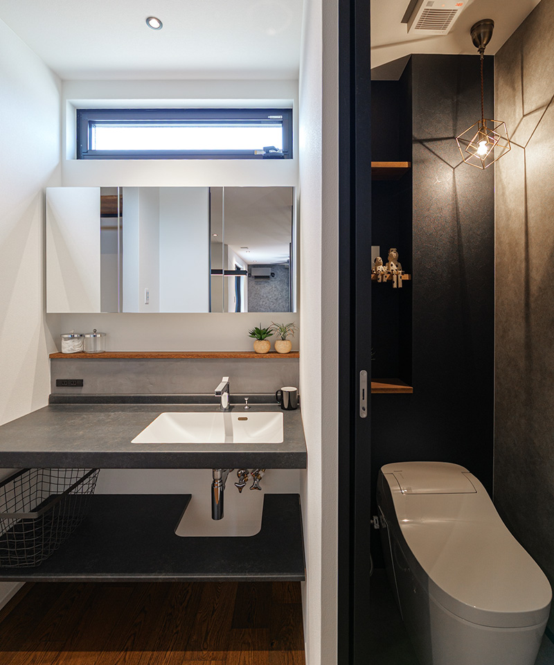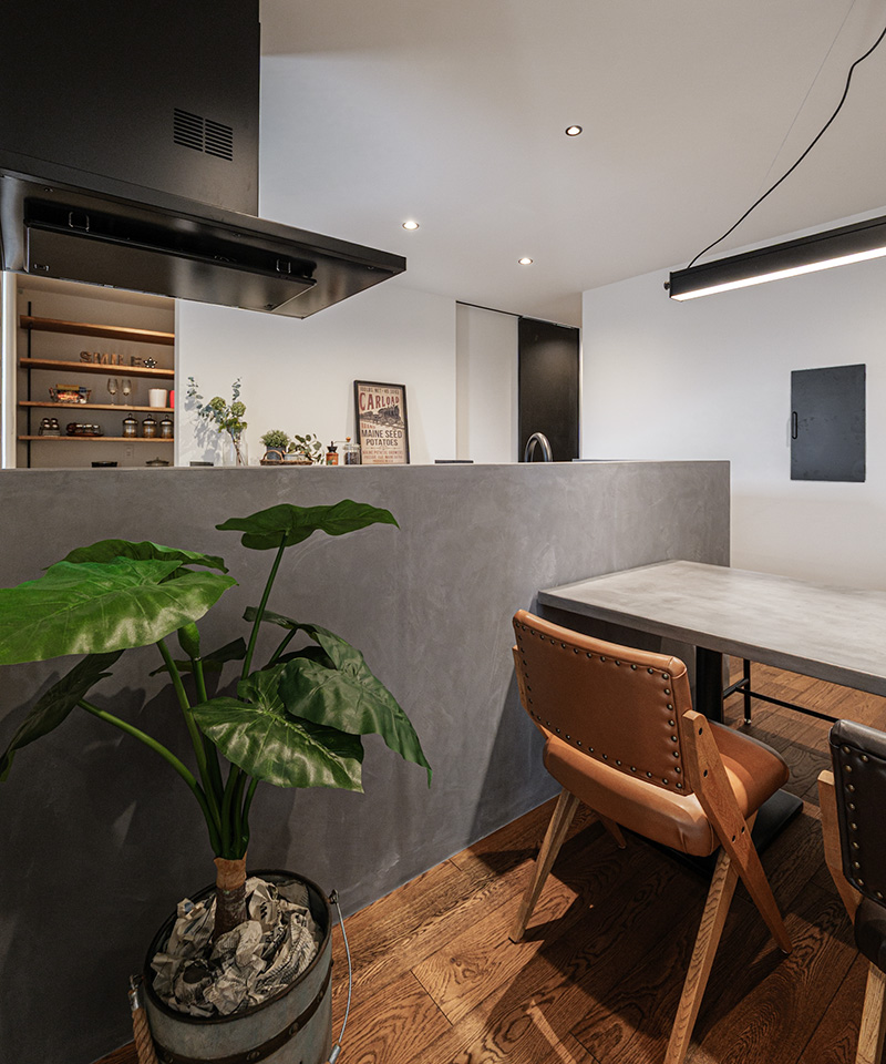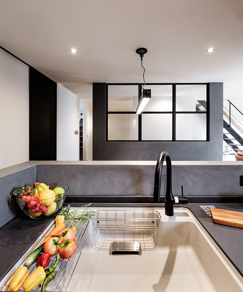 モールテックスの腰壁が手元を隠し、生活感を抑えながら落ち着いた印象をつくります。