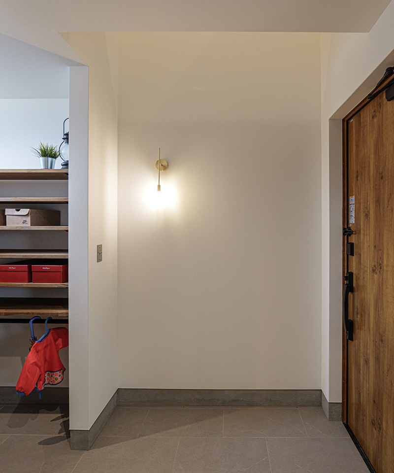 建物の道路側部分は入口扉以外、窓がない超シンプルな外観で、外壁は塗り壁でモダンな表情を作り出しています。