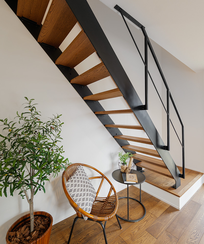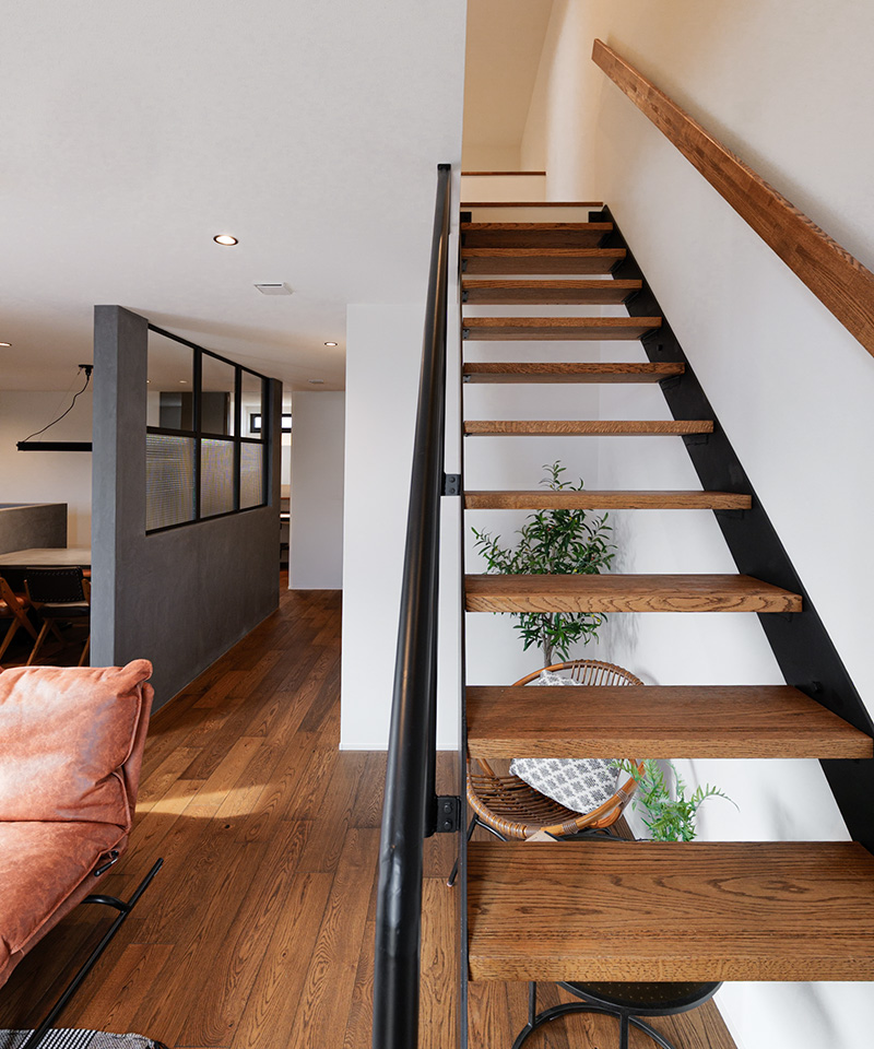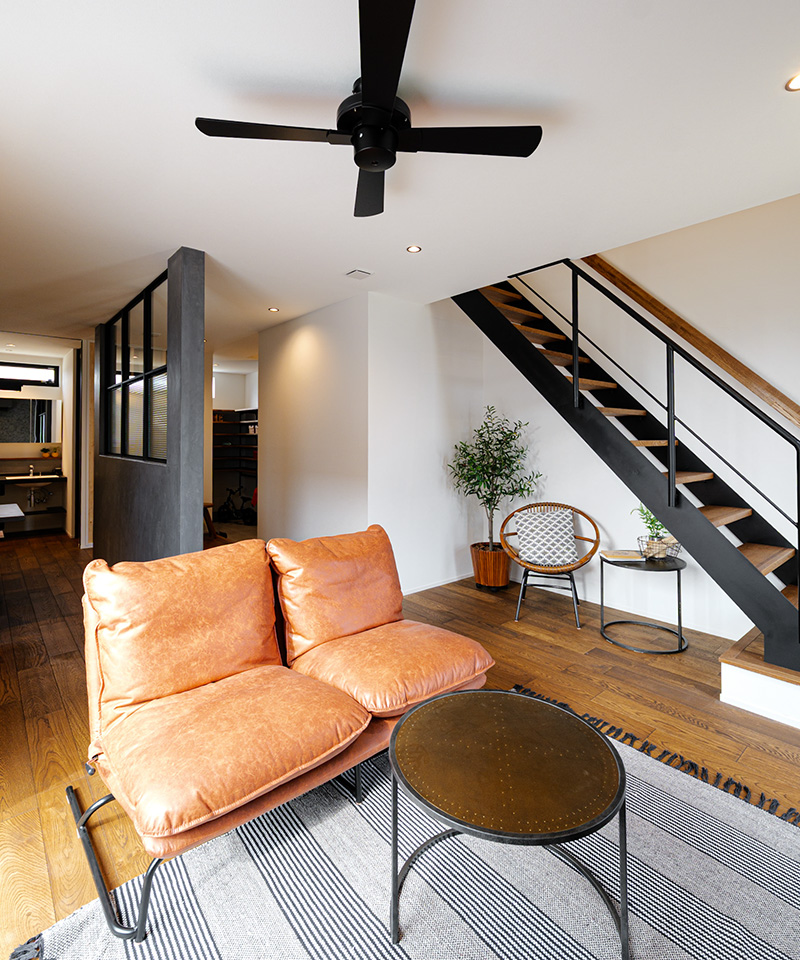 無機質な素材と温かみのある木質感を組み合わせた、大人かっこいい「インダストリアルスタイル」の内観。