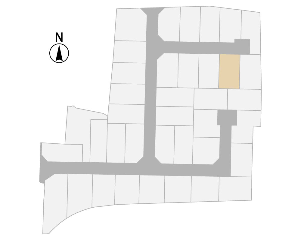 立地は28区画ある新しい分譲地の1区画。主要道路からも少し離れた場所なので、静かで暮らしやすい場所です。
