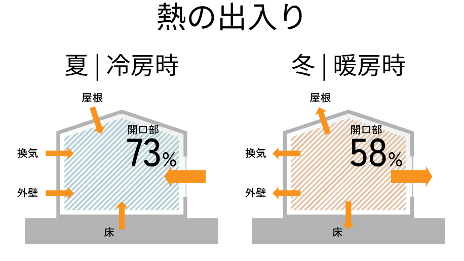 - 日本建材・住宅設備産業協会「住宅の部位別熱損失割合」より。冬期に室内の熱が約58%窓から逃げるとされる。