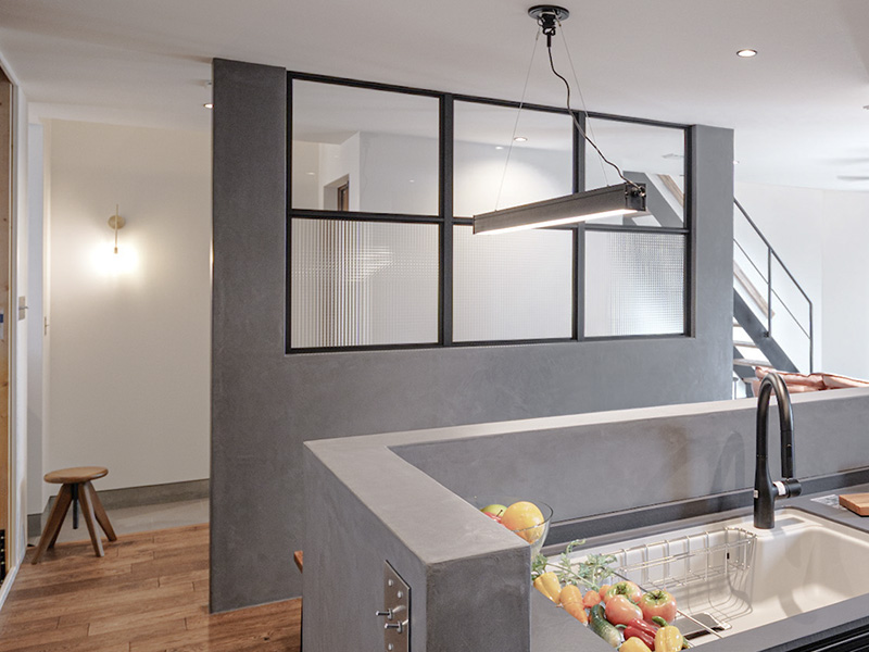 チェッカーガラスの室内窓が光を通しながら視線を遮り、二つの空間をつなぎます。